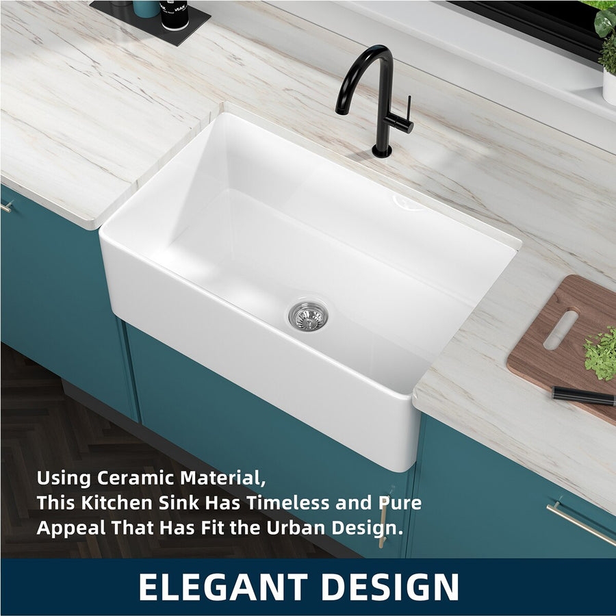 【Timeless Style】Gloss white greatly improves overall look of your kitchen sink, adding a splash of color for the whole kitchen. Our farmhouse sinks for kitchens are created with a naturally durable porcelain material that is specially designed for impact-resistance.Deep bowl design allows you to stack lots of pans, pots and dishes.
