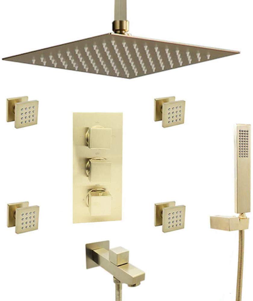 Includes: 12 inch rain shower head(Brass), handheld shower head(Brass), 15.7 inches shower arm(Brass), 1.5M shower hose(304 stainless steel),shower holder(Brass), water control valve(Brass ), 4PCS body jets(Brass),Tub Spout(Brass) TYPE: Thermostatic Shower System;Finish:Brushed Gold,Thermostatic design, no need to adjust temperature hardly each time. BRASS SHOWER HEAD: 12" shower head Constructed from solid brass to give you durable and natural rain shower experience. 4 PIECES SHOWER SPA BODY JETS: Enjoy a Full-Body Shower,With the Body Spray you can shower from all angles and enjoy an invigorating. BRASS TUB SPOUT AND HANDHELD SHOWERHEAD:High flow rate tub spout with switch -it could make water full your bathtub quickly or only make the hand shower head work well.
