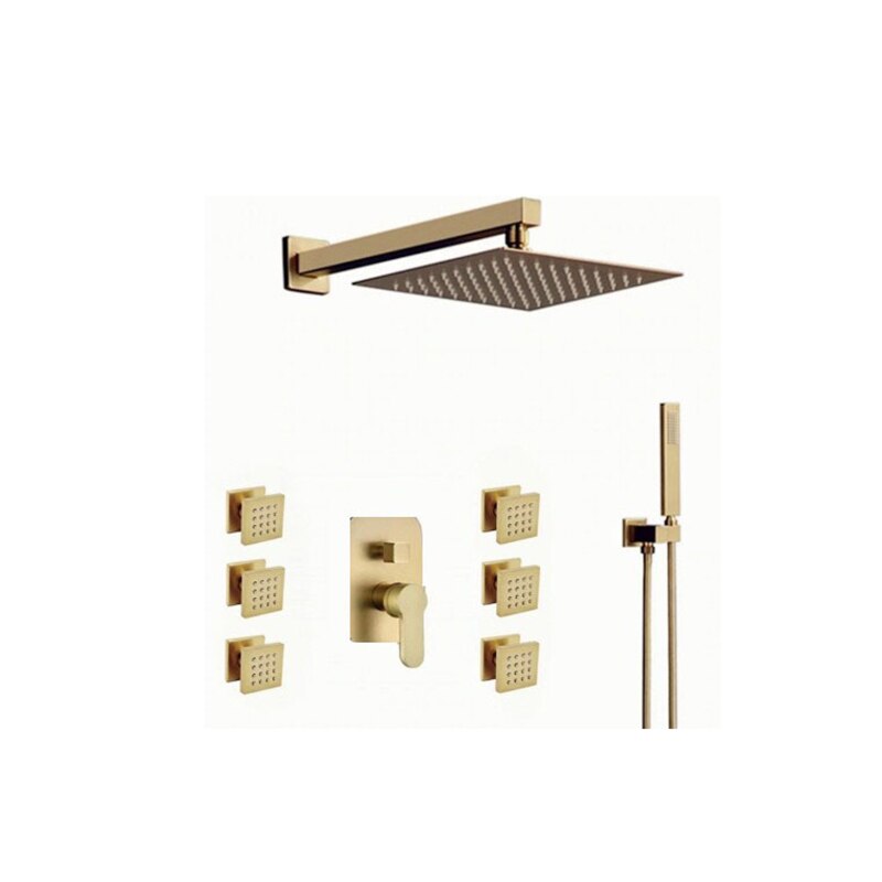 Brushed gold CSA square 12 inch 3 way function diverter with hand spray and 6 body jets shower kit