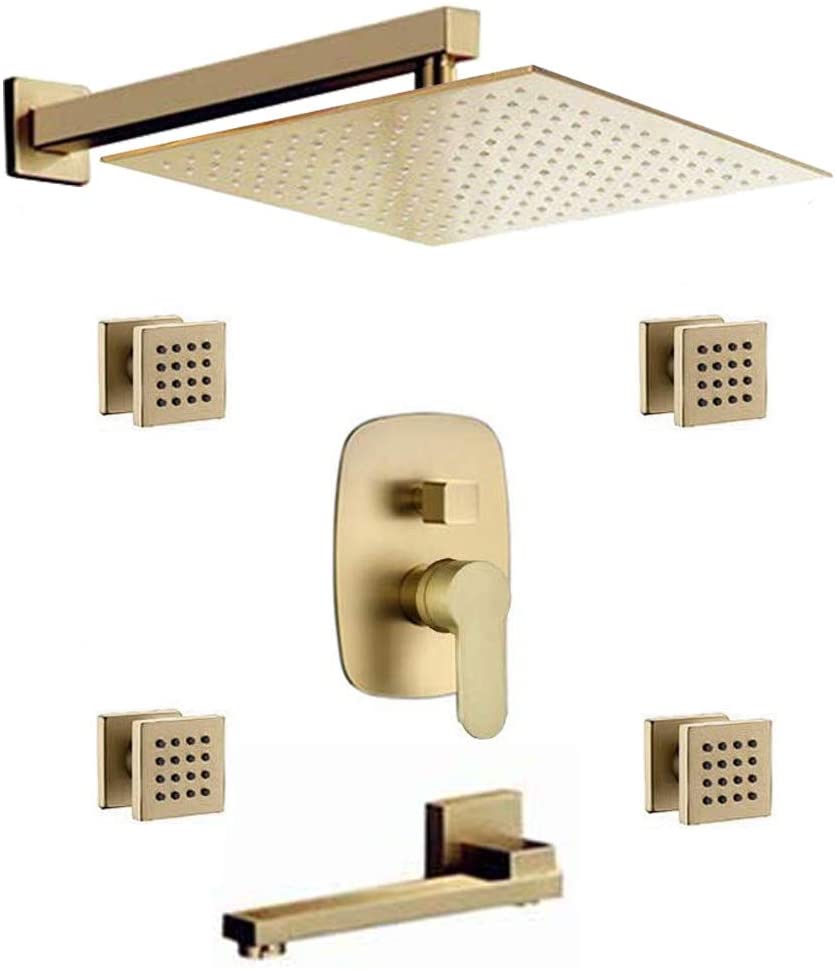 Brass Brushed Gold 12 Inch Wall Mount Rainfall Shower System With 4 PCS Body Jet Mixer Tub Set