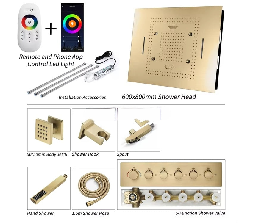 Brushed Gold -12"x12" Ceiling Flushmount LED Rain head and Mist Bluetooth Wifi Music completed system kit