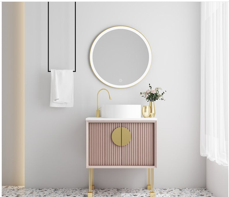Make a bold statement in your powderoom or bathroom with Pink Matte painted mdf wood with soft close BLUM hardware brushed gold hardware handles and legs and quartz counter top and roudn matte white or pink 14" vessel sink , Round LED mirror , Brushed Gold tall vessel Faucet ,P Trap and drain included