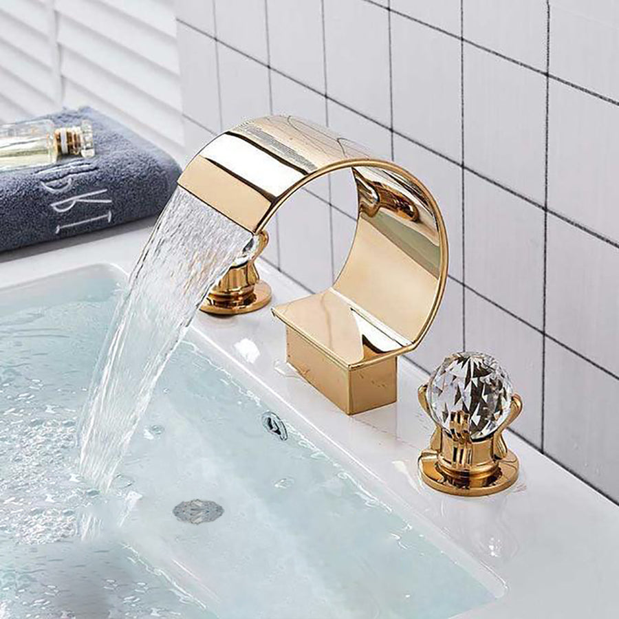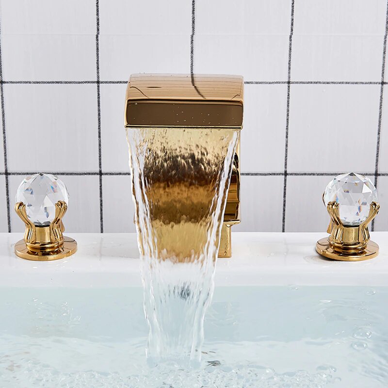 Gold polish waterfall 8" inch wide spread bathroom faucet with crystal handle
