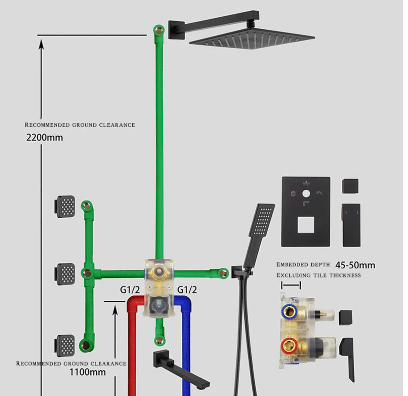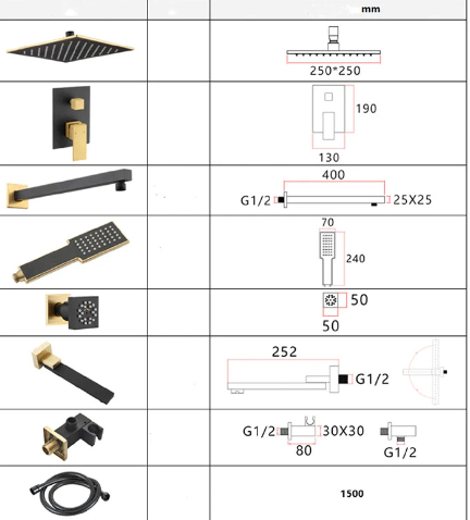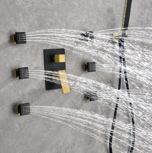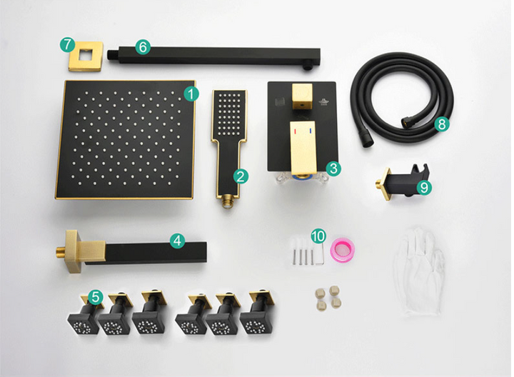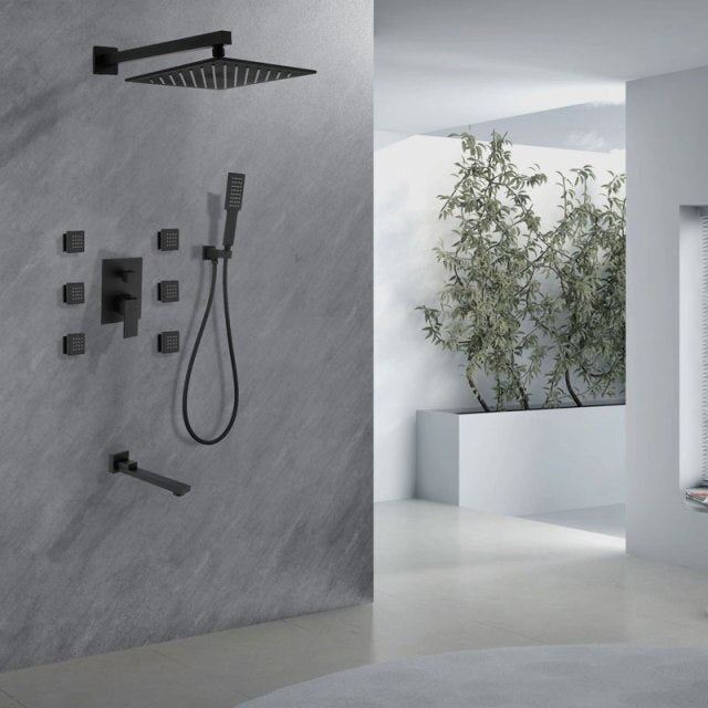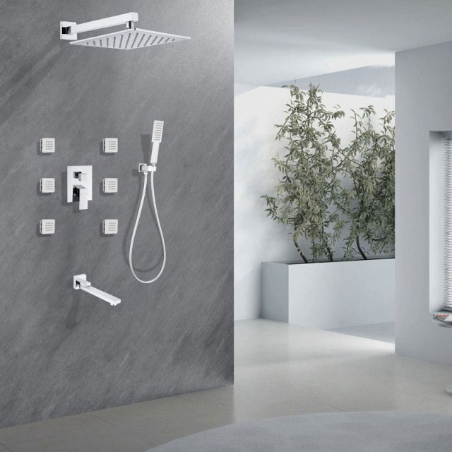10 Inch square rain head, 6 body jets ,hand spray and tub spout