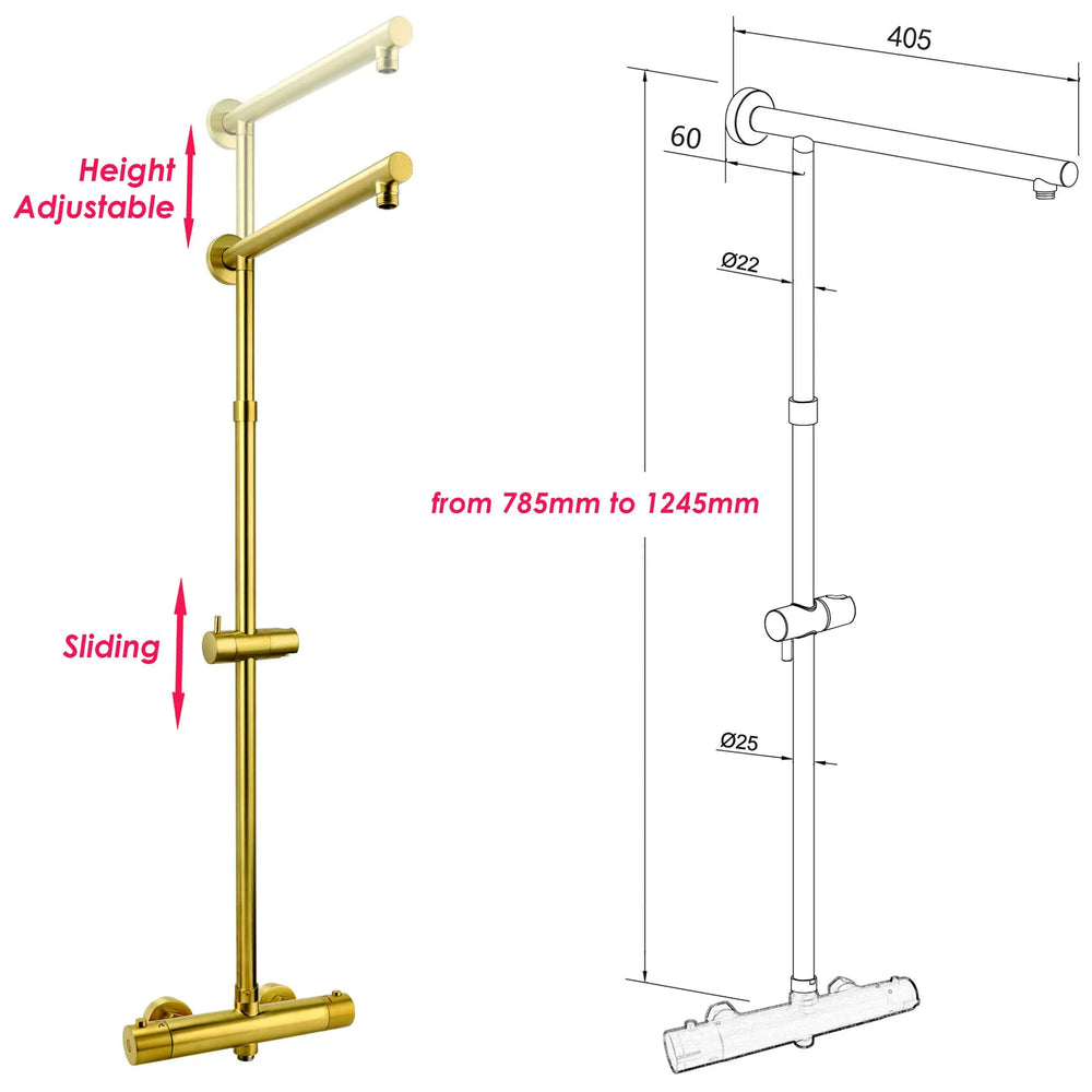 Brushed Gold Exposed Bathroom Twin 8/10/12'' Shower Head Hand Held Slider Bar Set Round Thermostatic Shower Mixer Valve