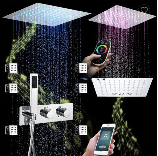 Introducing the latest from Sani Canada: a 12" x 12" ceiling flush mount LED spa Bluetooth music shower system. This thermostatic shower system features three functions: rain, waterfall, and a spray handle—a perfect solution for those days when you want to avoid wetting your hair and the hassle of cleaning the shower afterward.