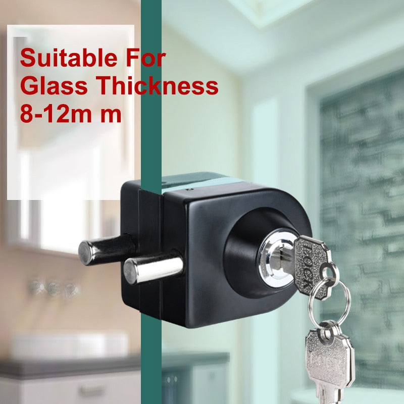 This lock installs easily on 2/5" to 1/2" (10mm-12mm) thick glass doors without drilling, preserving the door's integrity. Optional screws are included for added security against unauthorized access.