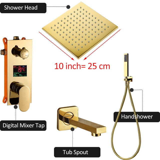 Golden Bathroom Shower Faucet: Concealed LED Rainfall Shower Head Tub Spout Digital Display Mixer Tap