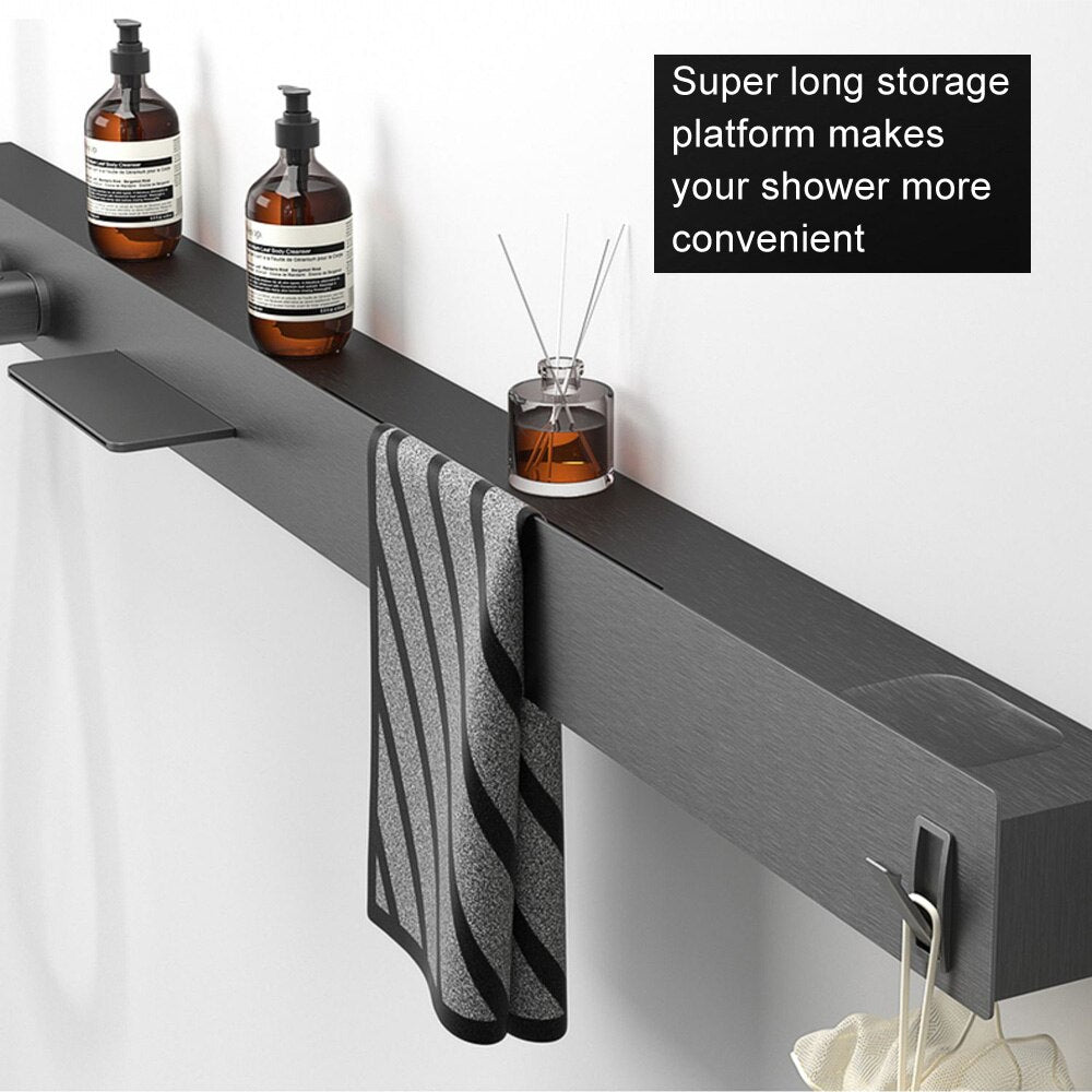 It's made of SUS304 and surface brushed gun grey, size of storage rack is 1500x100mm, There is a super long storage rack, you can put shower gel, towel, soap and many other shower supplies.