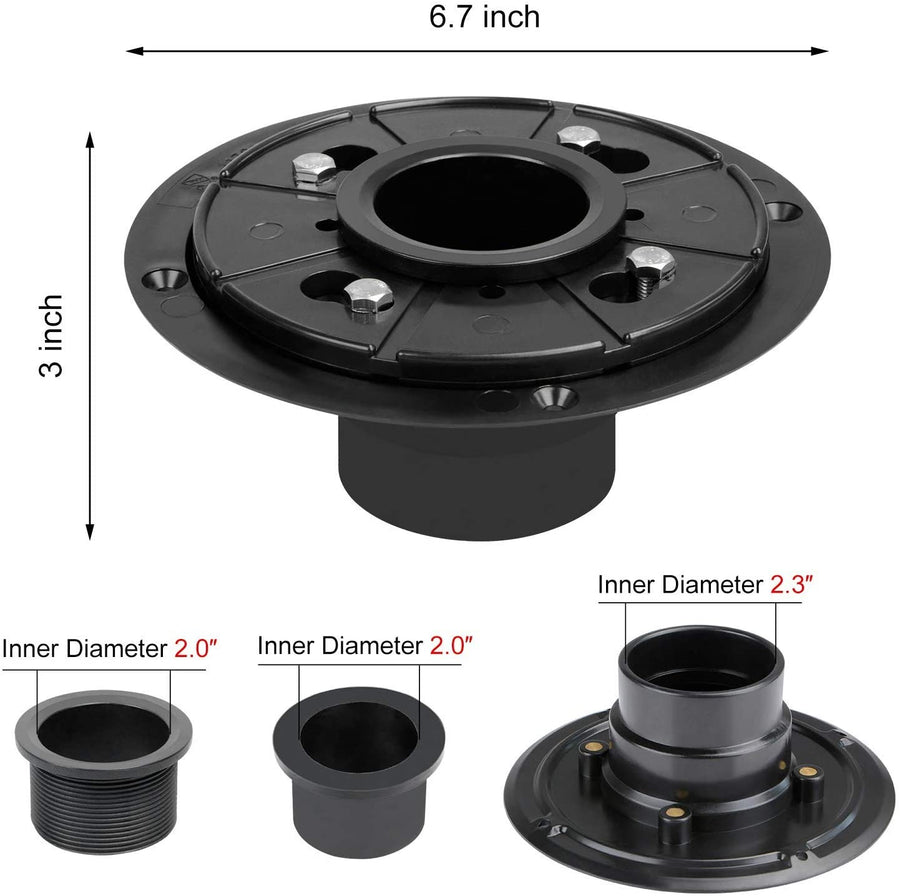 - AREAS of APPLICATION: The shower drain base is compatible with all 2-inch hub-less drainage pipes on the market. The diameter of the inner is 2.36 inches. It can be installed in any indoor or outdoor areas.