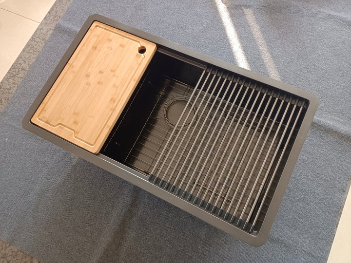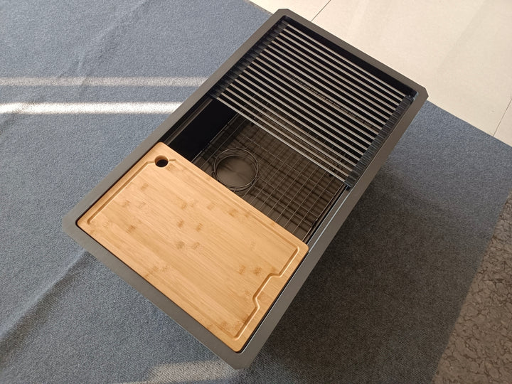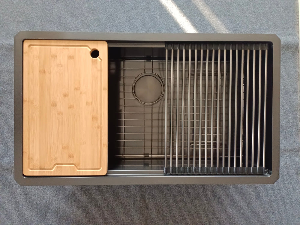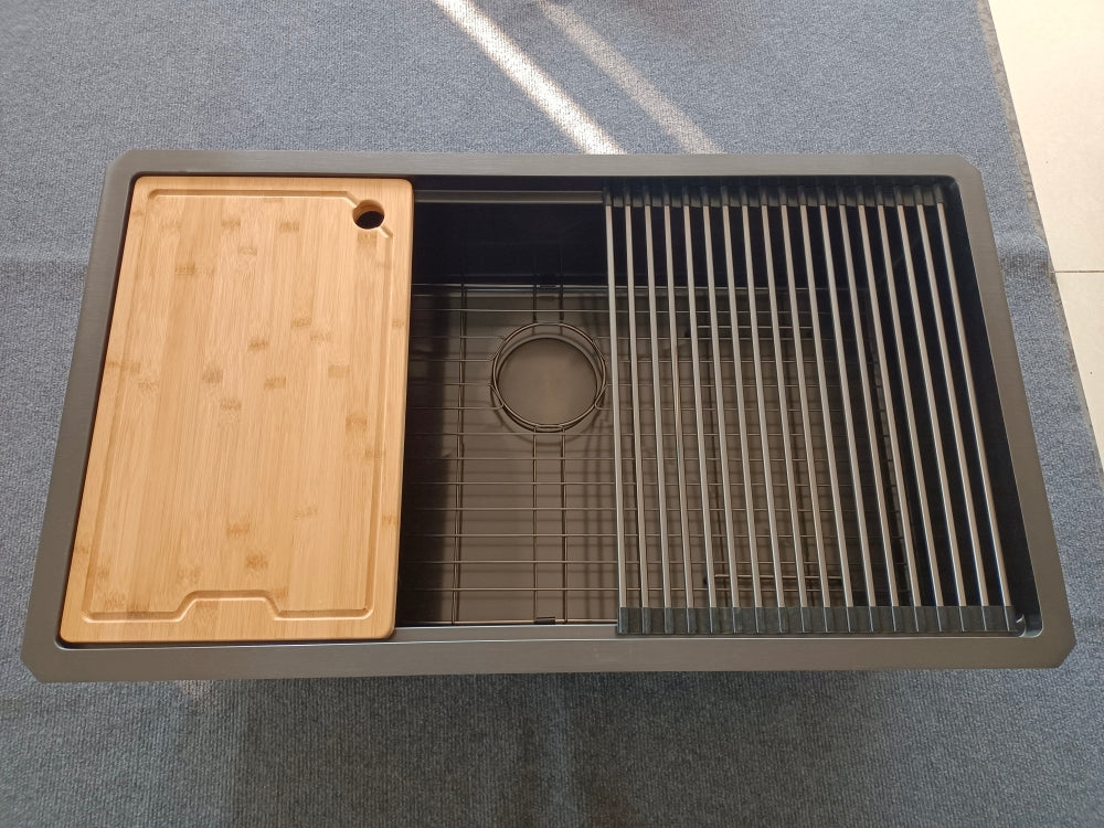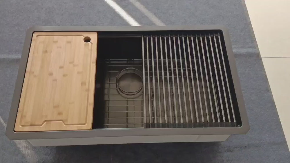 - Workstation Sink Design: The black undermount kitchen sink with single track - ledges on the front and back provide a track for sliding built-in accessories, include placement of cutting board, colander and roll-up dish drying rack, saving more workspace